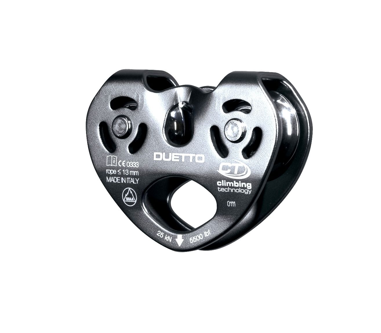 Роликовый блок "Duetto" с двумя расположенными в ряд роликами на шарикоподшипниках и фиксированными щечками. Максимальная нагрузка 25 kN. Для работы с веревкой диаметром до 13 мм включительно.