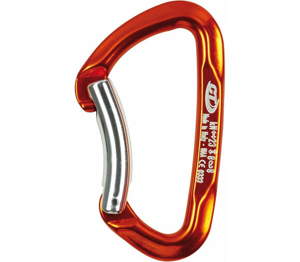Компактный карабин из легкого алюминиевого сплава с изогнутой защелкой, предназначенный для традиционного и спортивного скалолазания.