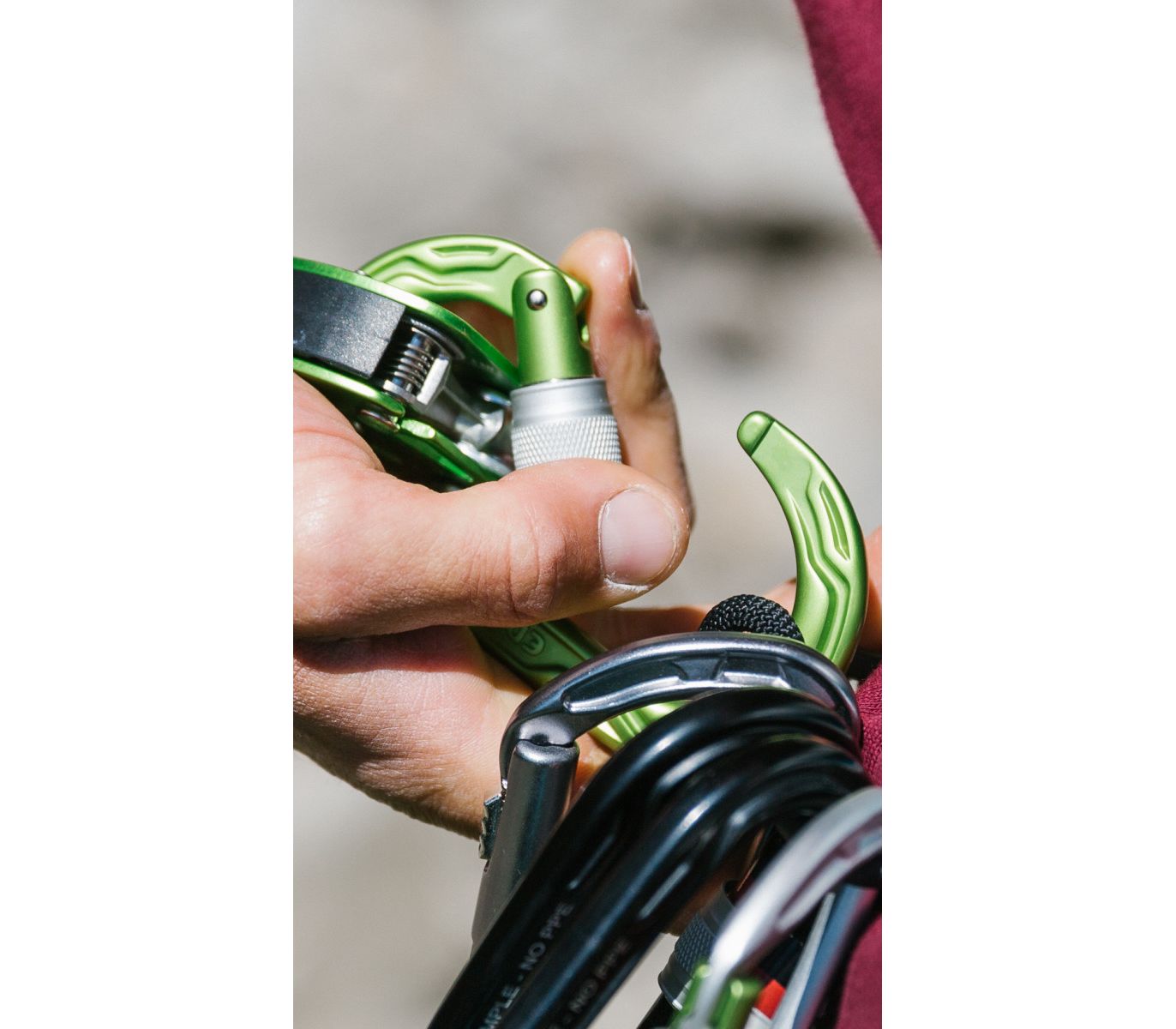 - «Немуфтований» режим — муфту можна згвинтити вниз і користуватися тільки защіпкою. Це зручно, якщо карабін часто використовується на маршруті або висить на обвʼязці в режимі готовності.