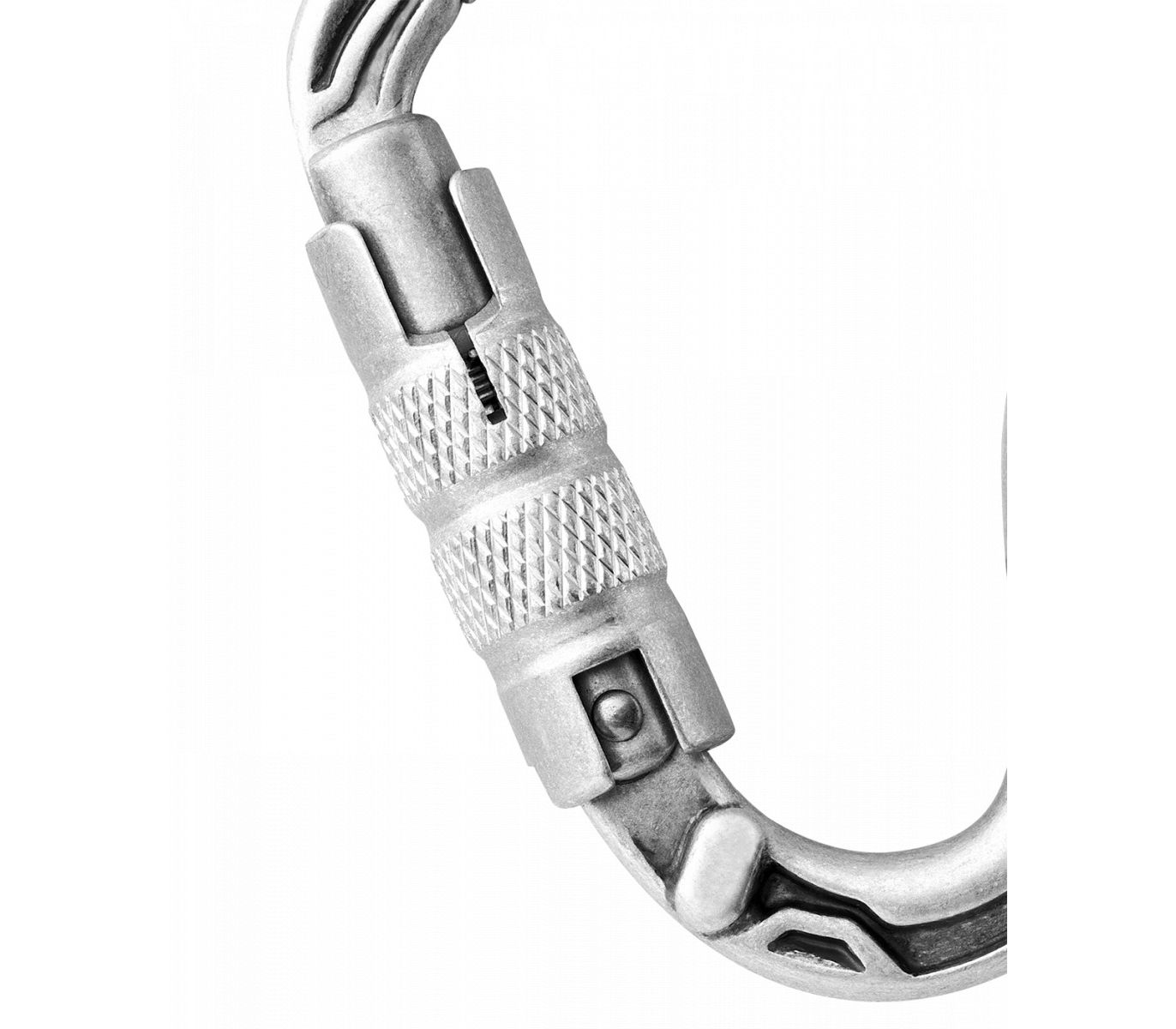- Карабін відкривається однією рукою. Механізм потребує певного тренування, проте забезпечує найвищий рівень захисту. Завдяки текстурній поверхні муфти з нею легко працювати, особливо у рукавичках.