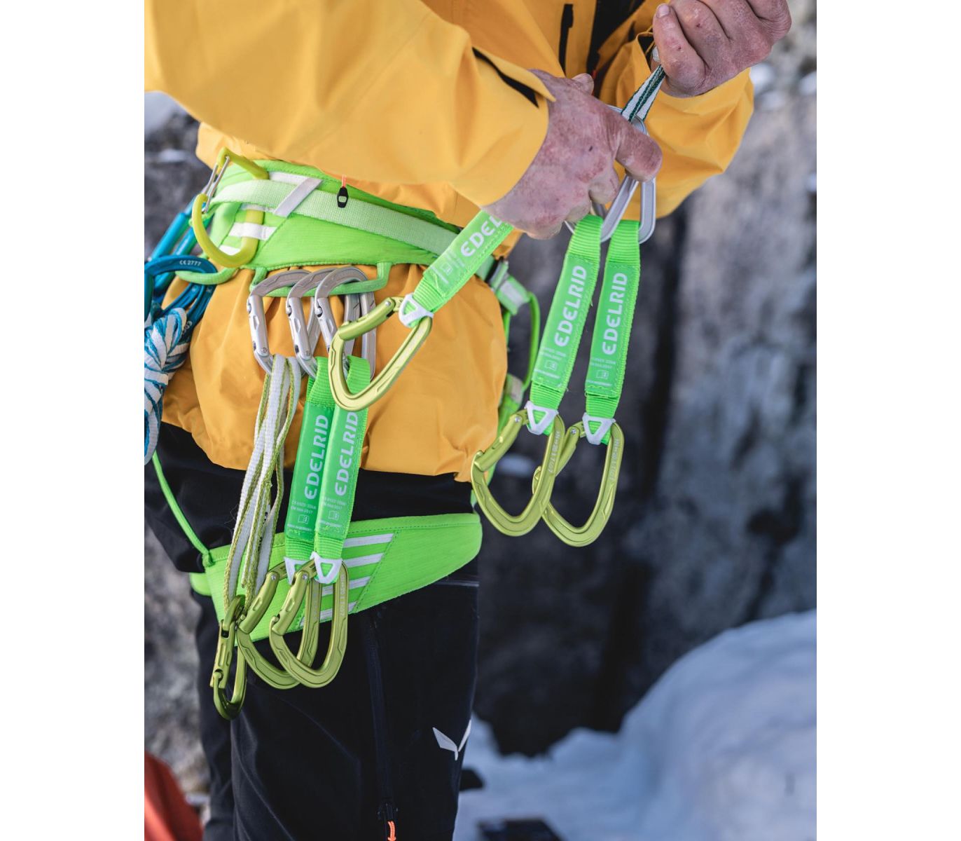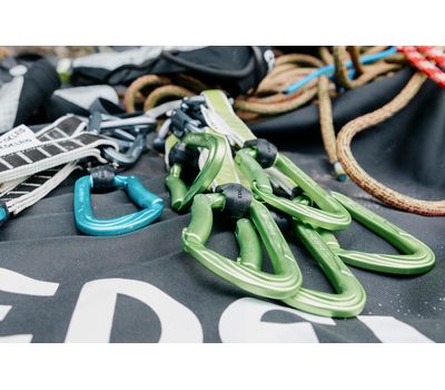 • Два міцні немуфтовані карабіни Edelrid Pure з прямою та увігнутою цілометалевими защіпками.