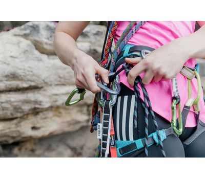 • Різні кольори допомагають на ходу визначати, який з карабінів приєднується до точки страховки, а який — до мотузки.