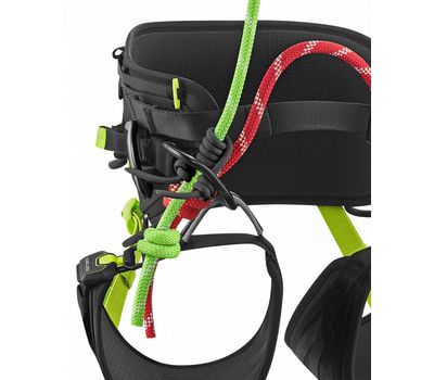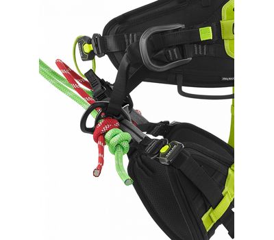 - Центральне страхувальне кільце з поліестеру адаптує систему до техніки однієї мотузки (Srt). Приєднується за допомогою знімного моста зі стропи. Як альтернативу текстильному кільцю, між двома мостами можна встановити карабін.