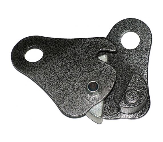 Крепится к веревке при раздвинутых «щечках». При замыкании «щечек» зажима карабином полностью охватывает веревку, исключая возможность ее выщелкивания.
