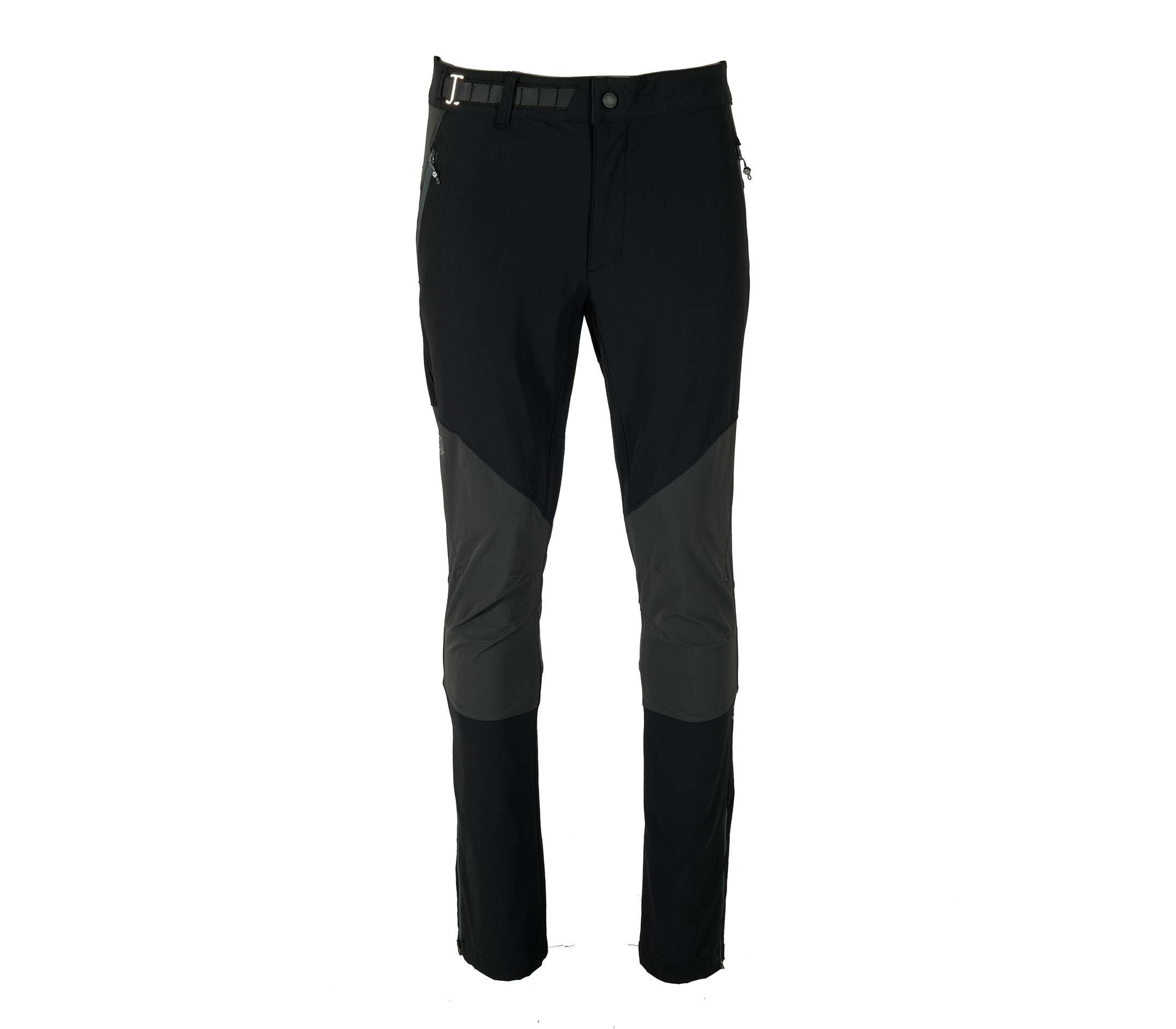 Крой брюк артикулированный, что вместе с эластичностью ткани обеспечивает удобную посадку и свободу движений. Пояс регулируется интегрированным ремнем с пряжкой. Есть два боковых кармана на молниях и один карман на молнии сзади.