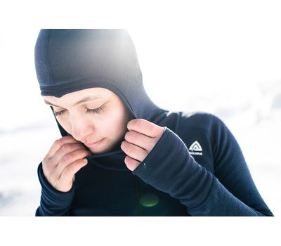 Облегающий капюшон помогает сохранить до 50% тепла тела — именно столько обычно уходит через шею и голову, если их не утеплять. Капюшон можно использовать тремя способами: как балаклаву, как высокий воротник или просто откинуть за спину, где он остается плоским, не мешает и не топорщится под верхней одеждой. Удлиненные рукава дополнены прорезями для больших пальцев, а два задних кармана на молнии помогут держать важные мелочи ближе к телу.