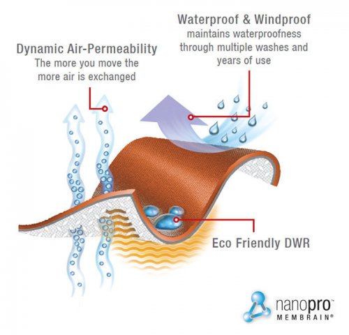 Для дальнейшего улучшения показателей воздухопроницаемости материал NanoPro Membrain™ подвергается ламинированию с помощью нового улучшенного процесса, который уменьшает количество клея, необходимого для надежного соединения мембраны с тканью.