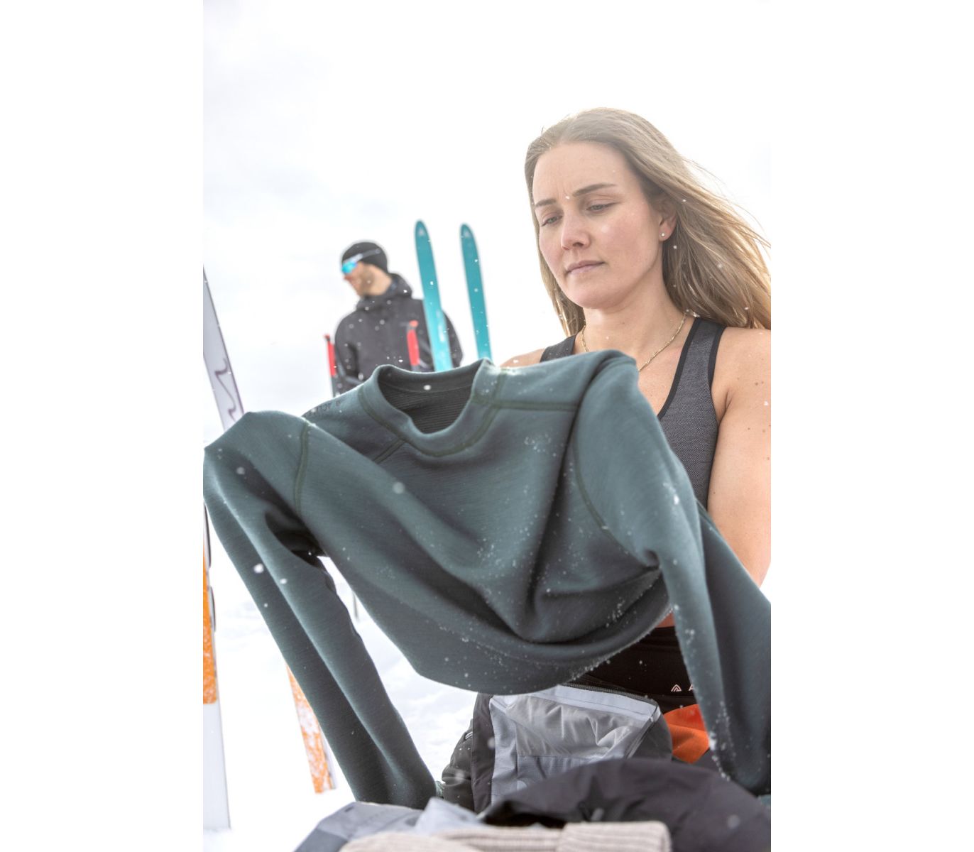 - Фірмове вʼязання StreamWool — мʼякий двосторонній трикотаж із функціональними повітряними каналами. Гладким боком до тіла тканина дає стандартну терморегуляцію. Перевернувши одяг рельєфом до тіла, ви отримуєте додаткове утеплення завдяки накопиченню повітря у каналах.