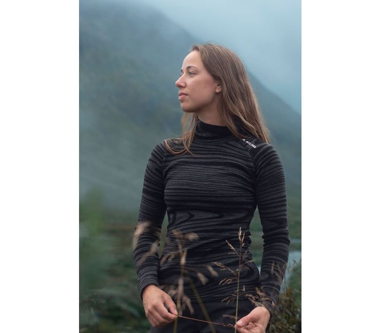 Тепла жіноча термокофта для зими та міжсезоння від норвезького бренду Aclima. Складається з чистої вовни мериноса, щільність тканини — 200 г/кв.м. Використовується як перший, натільний шар термобілизни, має обтислу посадку (slim fit). Висока горловина захищає шию від холоду.
