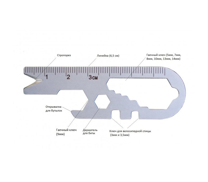 - Комплектация: мультитул (14 инструментов), кольцо для ключей