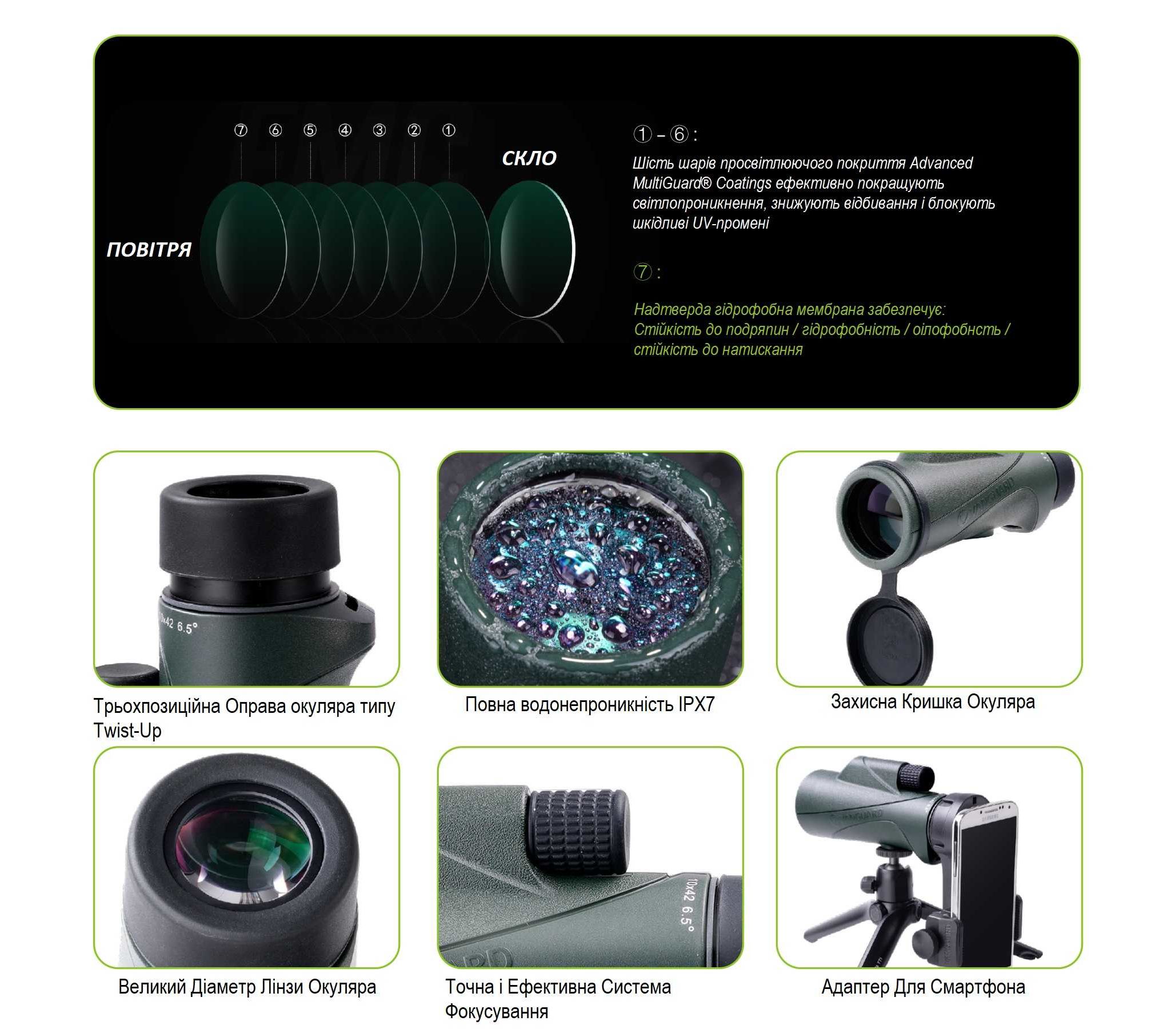 Advanced MultiGuard® Coatings. Наиболее технологичное семислойное широкополосное просветляющее покрытие, нанесенное на каждую оптическую поверхность, обеспечивает одинаково высокий уровень светопропускания оптической системы и непревзойденную натуральную цветопередачу практически во всем видимом диапазоне (от 320 Нм до 680 Нм). Дополнительно на внешнюю поверхность объектива и окуляра нанесена суперпрочная гидрофобная мембрана, которая предохраняет от царапин, препятствует скоплению воды на линзах и загрязнению маслами.