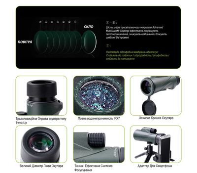 Tripod mountable. Не смотря на то, что в большинстве случаев наблюдения проводятся с монокуляром в руках, бывают ситуации, когда установка на штатив просто необходима. Большие увеличения, длительные наблюдения или съемка на камеру смартфона с помощью монокуляра требуют стабильного положения оптического прибора. Данная модель имеет резьбу для крепления штативного адаптера, расположенную в нижней части корпуса.