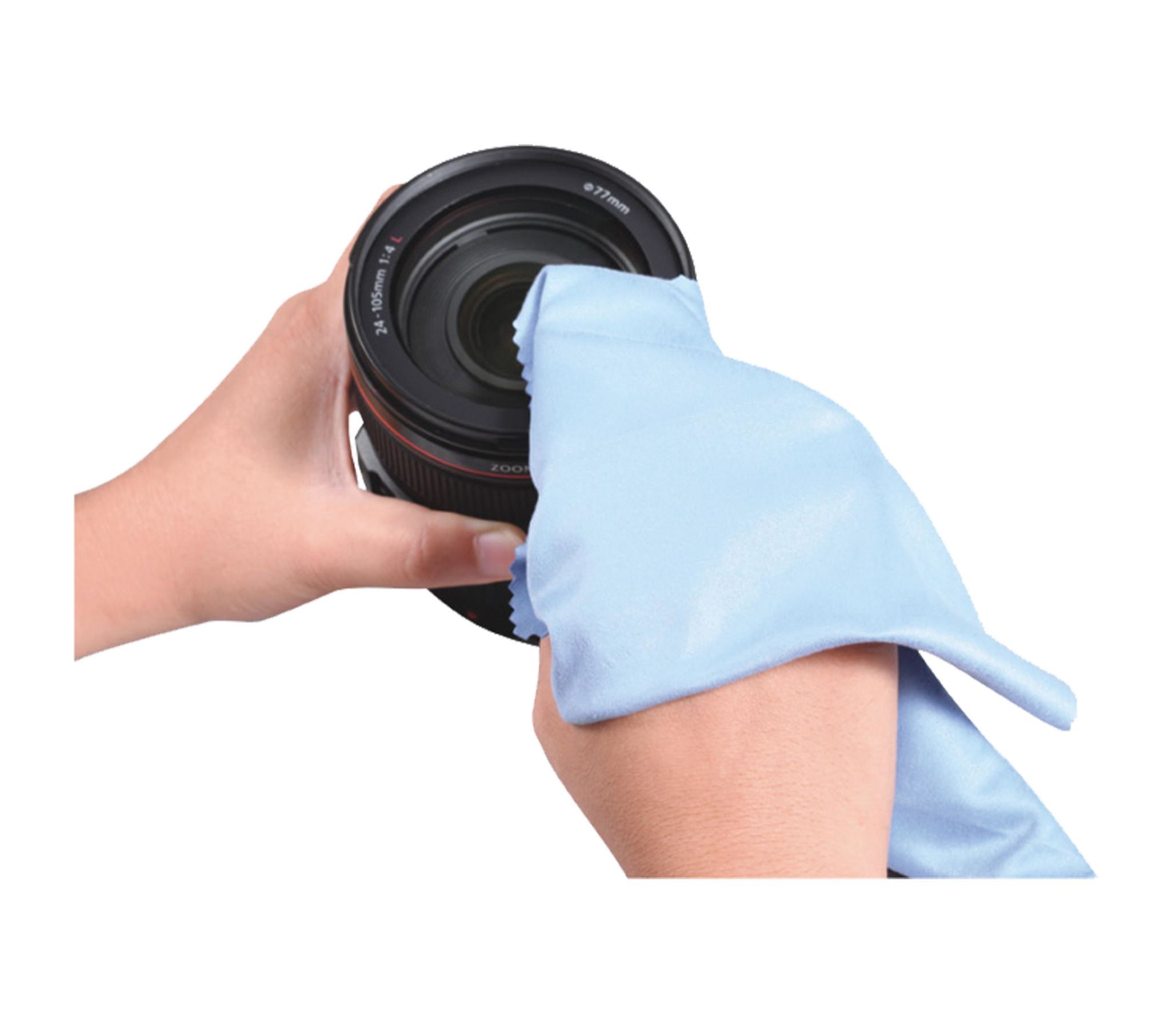 Большая салфетка из микрофибры очищает пыль и загрязнение из корпуса оптических приборов, а также пыль с линз, не оставляя при этом абразивных следов или мелкого ворса.