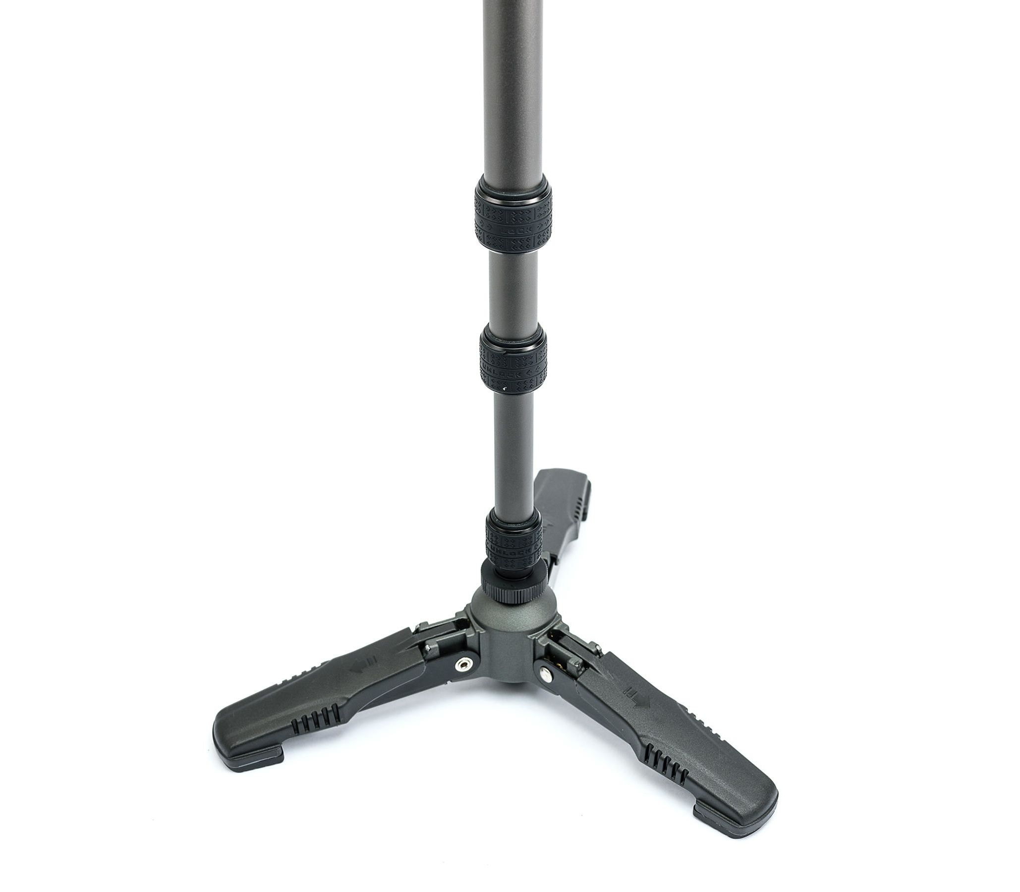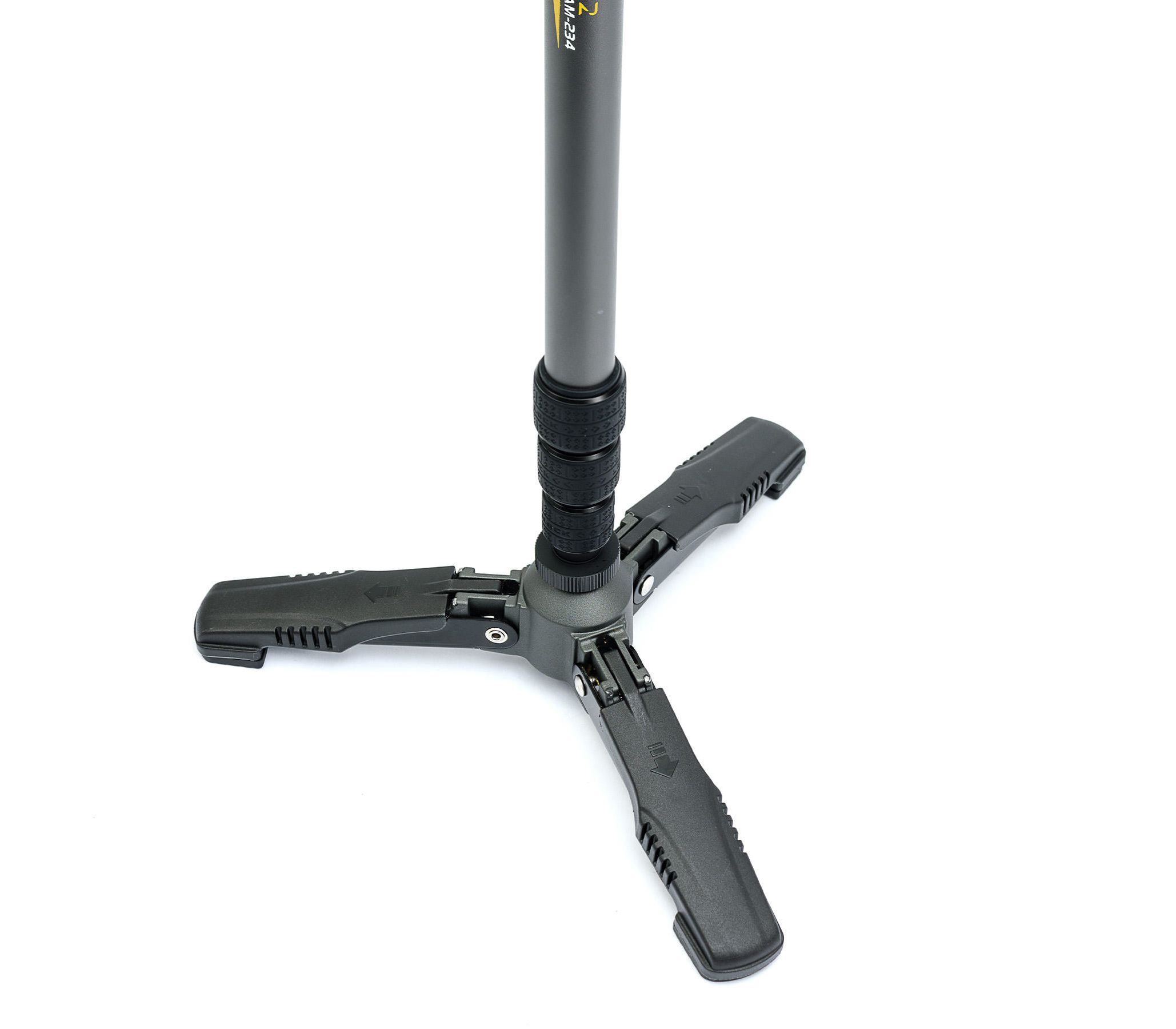 Tri-Feet. Занимая не многим больше места для установки, чем традиционный монопод, система опоры Tri-Feet делает монопод устойчивым и универсальным, позволяя более качественно проводить не только фото, но и видеосъемку. Три ножки находятся сложенным в транспортном положении, но моментально раскладываются при необходимости съемки. Благодаря использованию шарового шарнира в основании, монопод можно плавно наклонять в любую сторону, а также вращать вокруг своей оси на 360°, делая возможным быстрое прицеливание в любом направлении. Если необходимо получить максимальную устойчивость, - гаечный фиксатор блокирует движение шарового шарнира.
