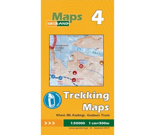 Туристичекая карта с горой Kazbegi (Казбек) и ключевыми локациями Khevi, Gudauri, Truso. Очень детальная карта с масштабом 1:50 000 (1см=500м), на которой указаны туристические маршруты, тропы, горизонтали, высота гор, водоёмы, основные дороги, места кемпингов, национальные парки, объекты и сооружения.