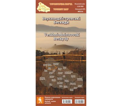 Наиболее подробная карта района украинских Карпат - Верхнеднестровские Бескиды. Издание 2020 года. Наиболее привлекательными для туриста в новой карте есть извилистая долина реки Стрый, истоки реки Днестр вблизи села Розлуч Турковского района, Цюховый Дил и районы для отдыхающих из Трускавца, Борислава и Сходницы, хребты по обе стороны от села Орив, скалы Ямельнице и Урича, водопады на потоках бани и Сопот и вершина Горб (Небесной Сотни), с которой открывается великолепный вид на долину реки Стрый.