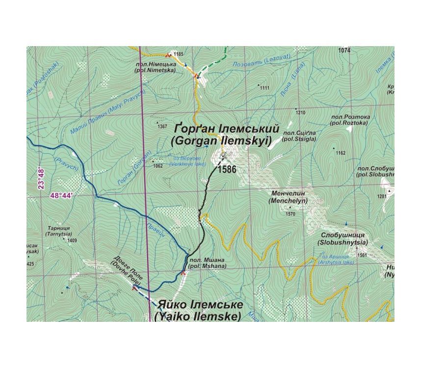 - Карта "Западные Горганы" включает горные прикарпатские и закарпатские села Мысливка, Вышков, Осмолода, Синевир, Синевирская Поляна, Негровец и Колочава и прилегающие к ним горные массивы, из которых можно сойти также в села Торунь, Липовиця, Суходол и Илемня.