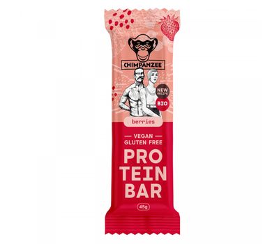 Chimpanzee Bio Protein Bar Berries — смачний, натуральний протеїновий батончик з фініками, ягідним соком та рисовим білком. На 99% складається з органічних продуктів без термічної обробки (raw). Безглютеновий.