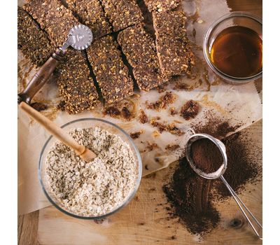 - Органическое пальмовое масло присутствует в небольшом количестве, сохраняя батончик упругим в жаркую погоду и мягким в холодную.