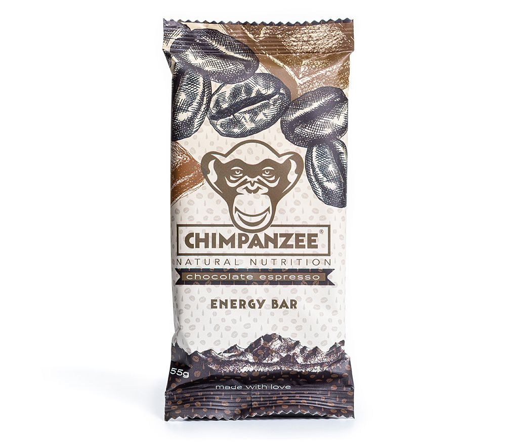 Chimpanzee Energy Bar Chocolate Espresso — энергетический батончик с кусочками шоколада и манящим кофейным ароматом. Имеет полностью натуральный состав, наполовину состоит из органических продуктов. Содержит микс быстрых и медленных углеводов для равномерного насыщения организма энергией.