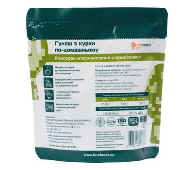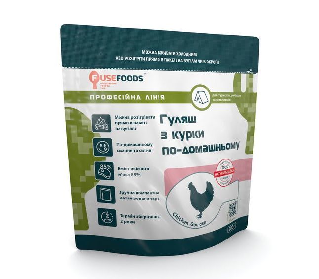 Гуляш из курицы по-домашнему Fuse Foods представляет собой полностью натуральное и готовое блюдо длительного хранения. Также подобные блюда называют - Meal, Ready-to-Eat или MRE «МРЕ» - «Пища, готовая к употреблению», а также ИРП - индивидуальный рацион питания. Высокоэнергетически питательные экологически чистые продукты - не содержит консервантов, усилителей вкуса, загустителей, стабилизаторов, регуляторов кислотности.