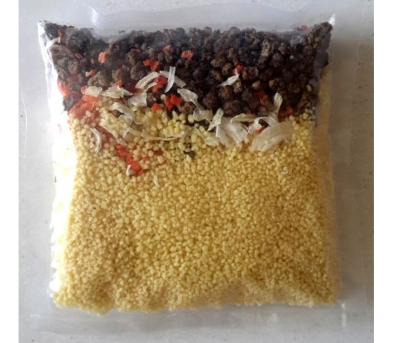 Состав: Кус-кус, сушеная вареная говядина, морковь сушеная, лук сушеный, укроп сушеный, соль, перец чёрный молотый.