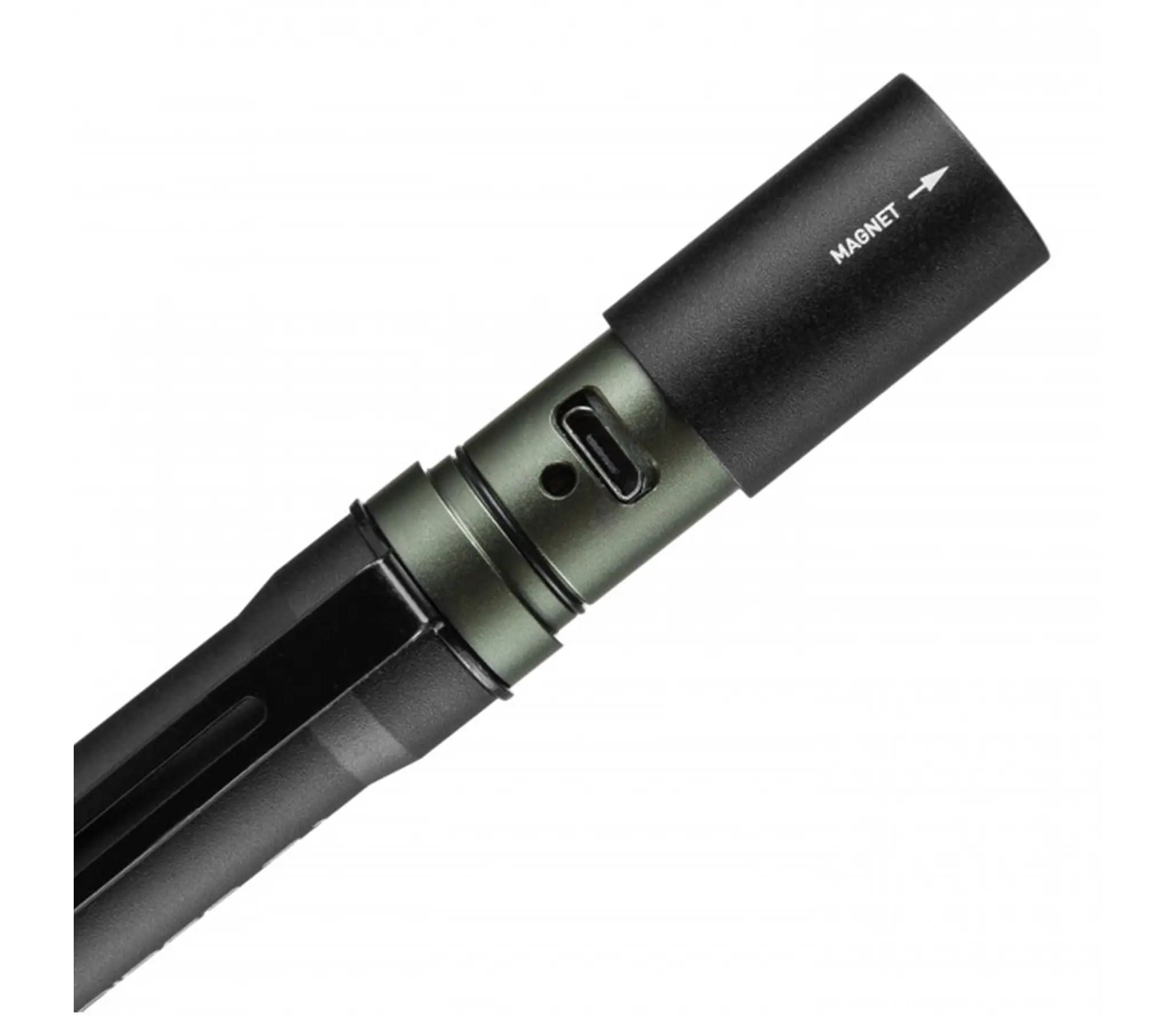 Кнопка включения фонаря находится в торцевой части корпуса прямо под магнитом. При нажатии включается последний использованный режим.