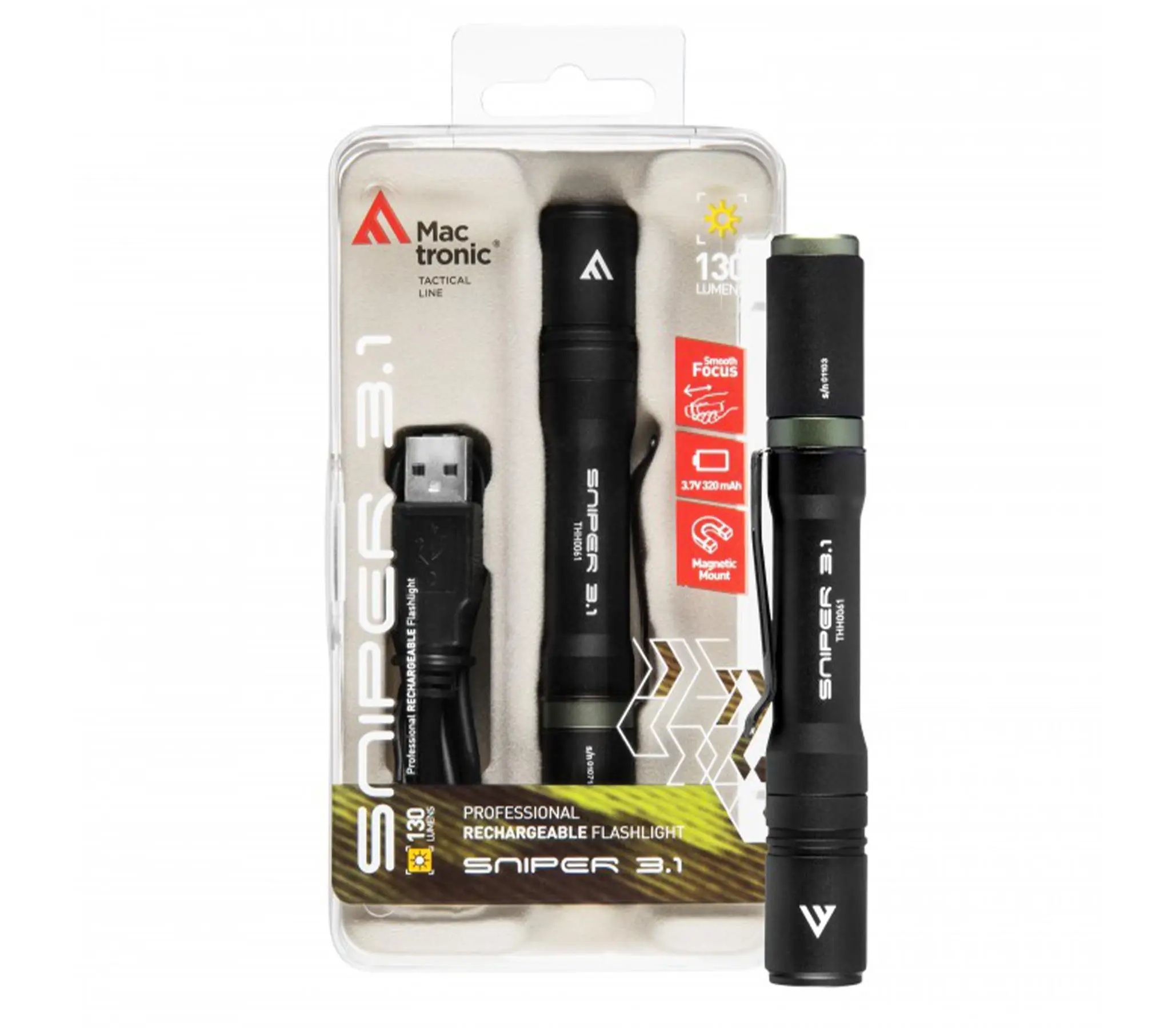 Фонарь тактический Mactronic Sniper 3.1 (130 Lm) USB Rechargeable Magnetic - это очень компактный и надежный тактический фонарь с выдвижной линзой. Эта особенность позволяет вручную регулировать расстояние, на котором фонарь будет освещать объекты, и угол луча. Благодаря этому данная модель способна эффективно освещать местность на расстоянии до 37 метров или осветить объекты рядом с вами. При весе всего 53 грамма Sniper 3.1 незаметно помещается в кармане вашей рабочей рубашки, благодаря чему он всегда под рукой, а мощный магнит на задней крышке освобождает ваши руки. Все это делает Mactronic Sniper 3.1 просто незаменимым при досмотре всевозможных механизмов и транспорта, проверке документов, ремонте и так далее. Светодиод LG™ 3W G2 является представителем класса очень эффективных светодиодов и имеет ресурс свыше 50000 часов.