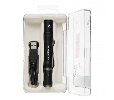 Фонарь укомплектован прозрачным футляром для хранения и переноски, клипсой и кабелем micro USB (50 см) для зарядки. Разъем зарядки скрыт под сдвигающимся колпачком.