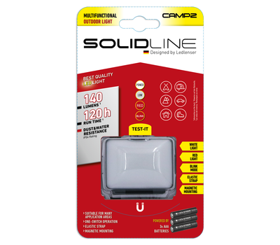 Solidline Camp2 - це невеликий і практичний багатофункціональний кемпінговий ліхтар, який знадобиться і вдома, і в гаражі. Його можна використовувати в поході, як лампу на тумбочці або як запасний світло «про всяк випадок». Завдяки білим та червоним світлодіодам модель Camp2 забезпечує приємне світло без відблисків у невеликому форматі. Продумані варіанти кріплення (вбудований магніт для кріплення на металевих поверхнях, наприклад витяжку над плитою) і еластичний шнур для кріплення на трубоподібних об'єктах) означають, що ліхтар можна використовувати по-різному. Camp2 живиться від трьох батарейок типу ААА.