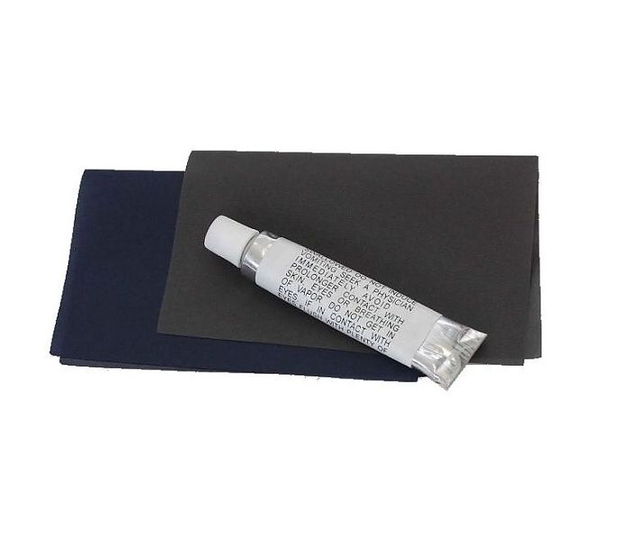 Набор для проффесиональной и экстренной починки поврежденного коврика, который включает две латки и клей.