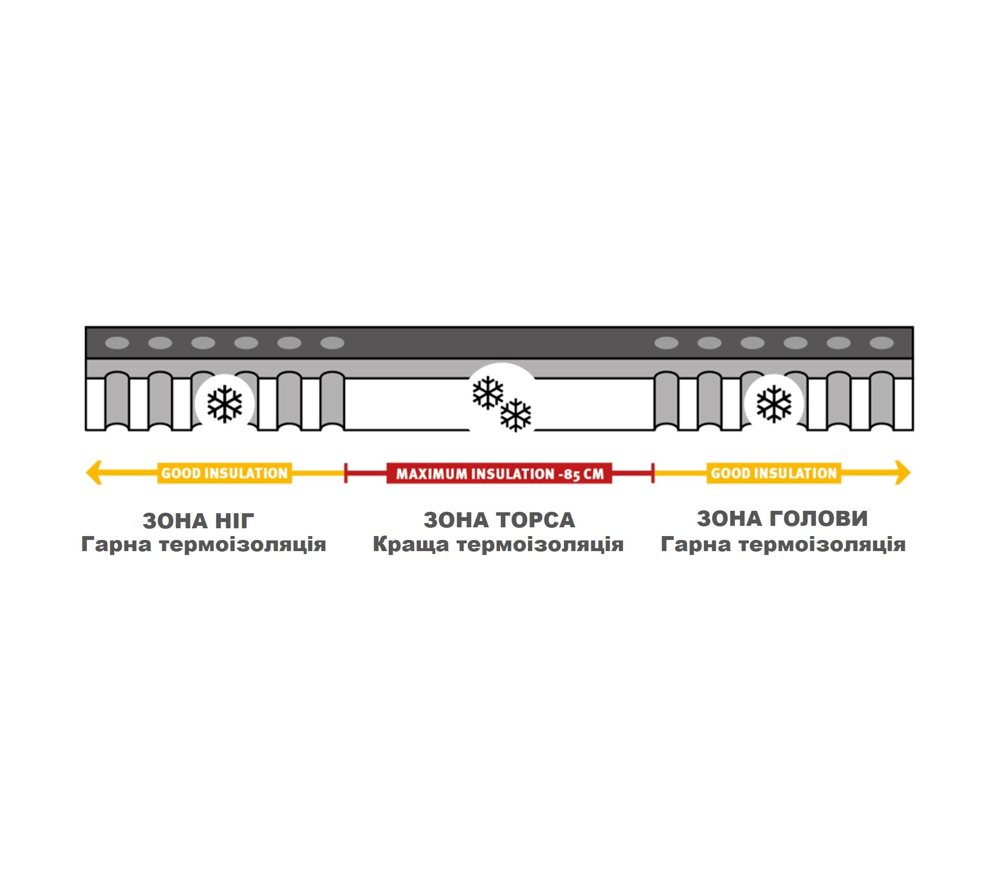 - Зональная технология Core Comfort Concept позволяет, благодаря перфорации наполнителя в зонах ног и головы, достичь минимального веса, не снизив при этом теплоизоляционные характеристики. В средней части коврика (в области торса) где осуществляется наибольшее давление, наполнитель не имеет перфорации, обеспечивая необходимую мягкость и теплоизоляцию.
