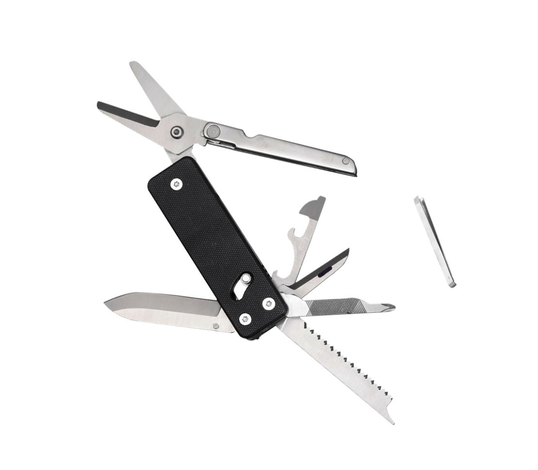 Модель оснащена декількома повноформатними інструментами: ножем та ножицями. Клинок має класичну форму Drop Point і пряме заточування, що робить з нього універсальний інструмент, актуальний для нарізання продуктів харчування, перерізування мотузок та зрізання дрібних гілок. Ножиці мають рукоятки зручної довжини, тому не вислизають із руки і не тиснуть шкіру долоні під час різання паперу, кабелю і навіть таких щільних матеріалів, як гума та вироби зі шкіри.