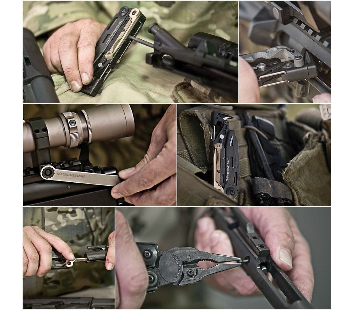 Leatherman MUT має кілька місць для кріплення стрижнів, що чистять, і щіток з різьбленням, а також вбудовану стандартну викрутку і біти Torx для будь-яких робіт. Інші інструменти включають плоскогубці, комбінований ніж 420HC, пилку, молоток і т.д. Поставляється з чохлом MOLLE та гайковим ключем 3/8” для регулювання оптичного прицілу та відкритих прицільних приладів.