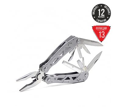 це зручний у всіх відносинах багатофункціональний інструмент. Він повністю нержавіючий, що важливо для використання за містом. Всі інструменти продумані до найдрібніших деталей. Вони міцні, ефективні у виконанні свого завдання, не схильні до корозії. У порожніх зсередини рукоятках мультитула розташовуються відкривачка для консервів і для пляшок, шило, два ножі: з гладкою і серрейторной заточкою, три різних за розміром і форму викрутки, лінійка. Крім того, мультитул легко перетворюється при відкритті обох ручок в повнорозмірні плоскогубці. Вони ж можуть виконувати роль кусачок. Інструмент обладнань захопленням для гайок.