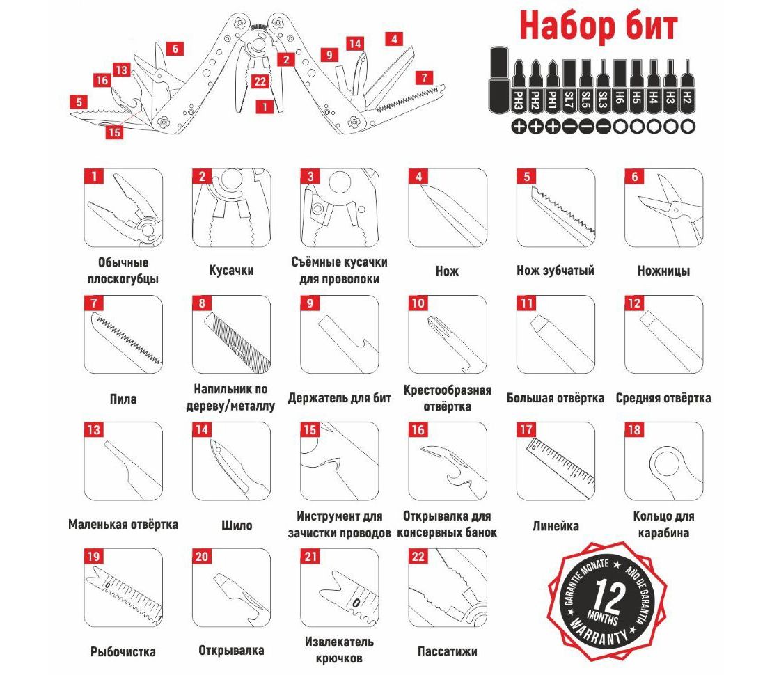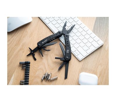 Розмір інструменту - 10,5х5см. Товщина - 1,5 см. При цьому комплектність мультитула становить 22 інструменту, що робить його багатофункціональним і при цьому по-справжньому ергономічним.
