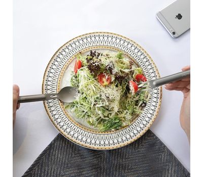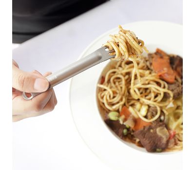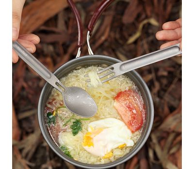 Перш за все, ложка і вилка оптимальні для комфортного захоплення рукою. Поглиблена ложка сприяє тому, щоб ви могли зачерпнути більше їжі і з задоволенням її з'їсти. Титанова вилка-ложка природно стійка до іржі, стійка до впливу кислот і лугів. Вам не потрібно турбуватися про те, що будь-які з різновидів страв можуть зіпсувати зовнішній вигляд виробів і піддати їх корозії. Столові прибори мають лаконічний дизайн, мають матову делікатну поверхню, привабливий колір. Їх зовнішній вигляд бездоганний, і не містить в собі нічого зайвого.