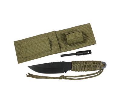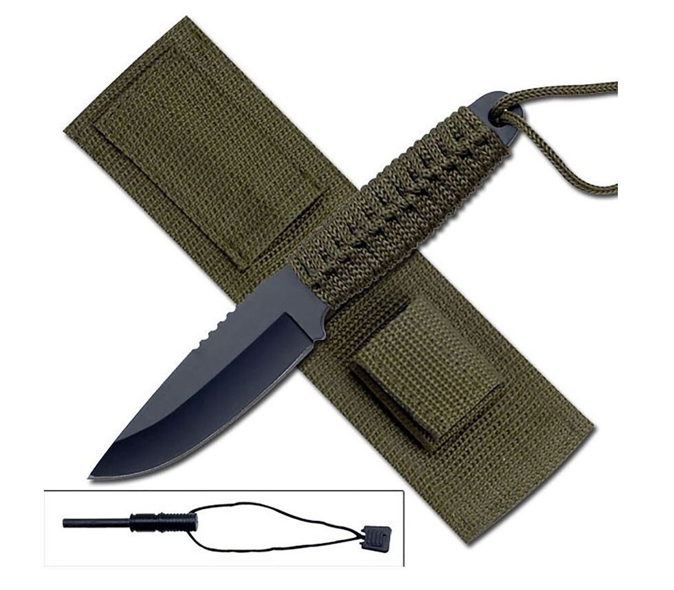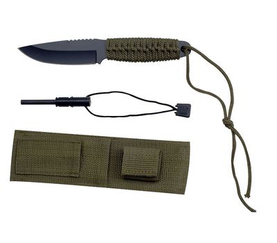 Фіксований мисливський ніж з паракордовою оплеткою рукояті припаде також до смаку любителям відпочинку на природі. Оливкові мінімалістичні нейлонові піхви на липучці дозволяють швидко витягувати клинок. У комплекті також постачається кресало.