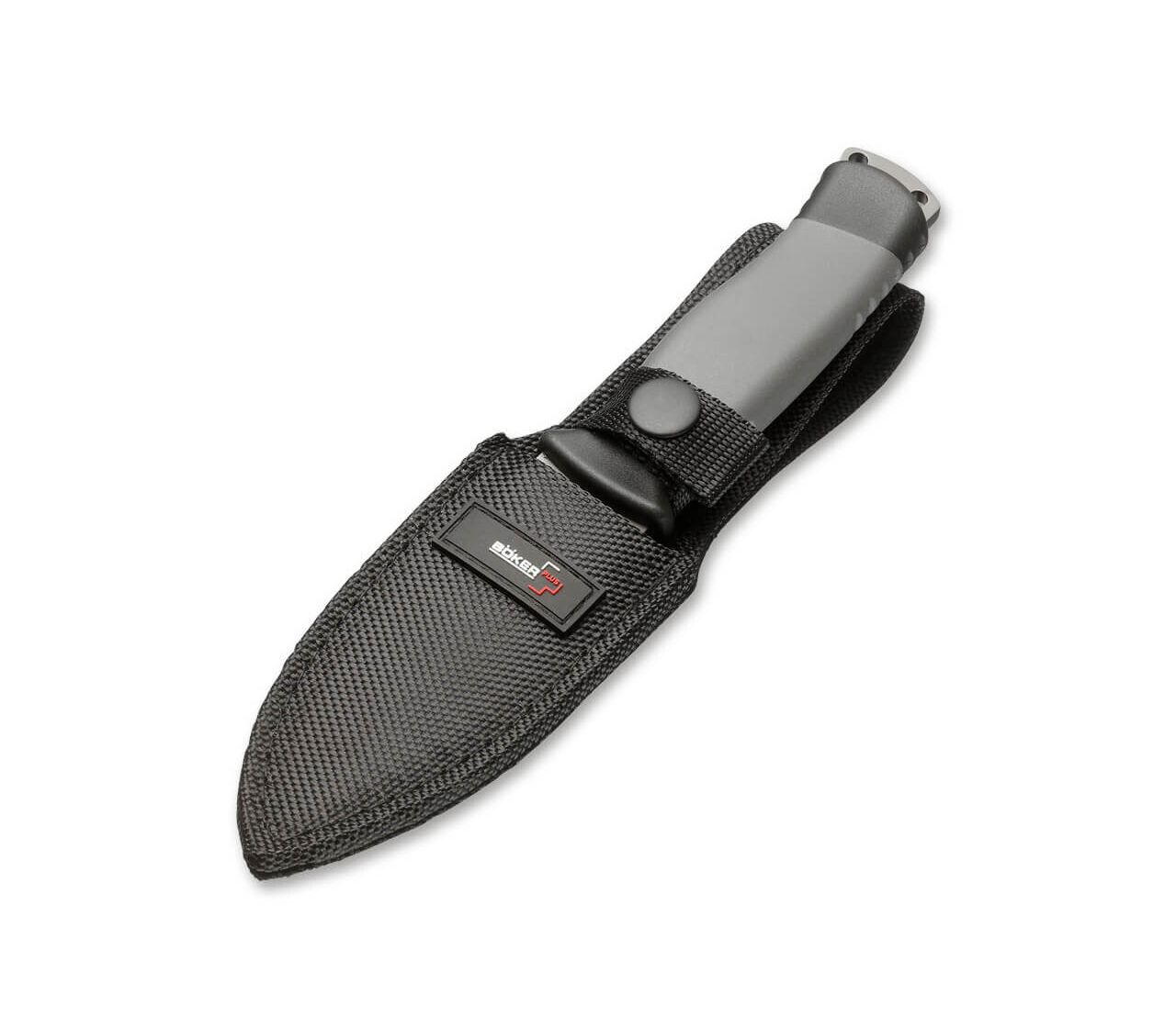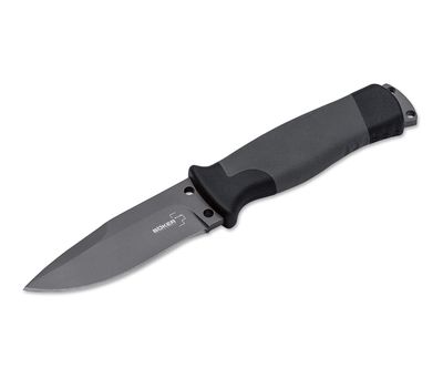 Boker Plus Outdoorsman компактний, але потужний та пристосований для стовідсоткової корисності. Суцільний хвостовик (фулл танг) і широке лезо забезпечують максимальну стійкість, а кінець рукоятки, що виступає, має форму молотка. Рукоятка із прогумованого армованого склопластику має велику зону захоплення, виготовлену із зручного термопластичного каучуку, тому гарантується дуже безпечне та комфортне поводження навіть у вологих чи холодних умовах. Лезо виготовлене із шведської сталі марки 12С27 та має титанове покриття для підвищення захисту від корозії. Отвори в хвостовику дозволяють не тільки прикріпити темляк, але й легко прикріпити його до ціпка, щоб використовувати його як імпровізований гарпун. Компактний компаньйон для повсякденного життя, будь-якої ситуації на природі чи полювання. Постачається з практичним чохлом із нейлону.