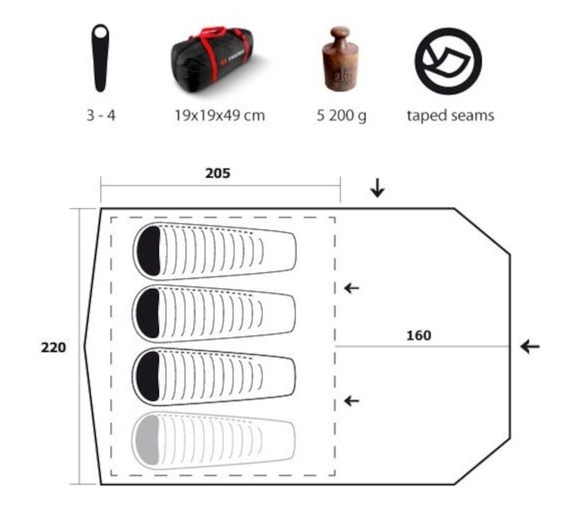 Намет для 3-4 людей із великим та доступним тамбуром. Його можна відкрити з двох сторін. Додатковий простір зручно використовувати для зберігання багажу. Намет також придатний для сімейного відпочинку. Перевагою намету є комфорт та варіабельність у використанні.