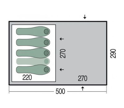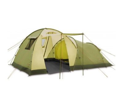 Семейная кемпинговая палатка, идеально подходит для продолжительного отдыха. Очень большая прихожая в виде купола может использоваться как столовая или кухня даже при плохой погоде. В спальне свободно размещается до 5 человек. Внешний тент может быть установлен без внутренней палатки