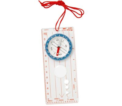 Також є кругові та трикутні вирізи для малювання точок орієнтування на карті. Маркування світиться – зручно використовувати у темний період доби. Є сантиметрова лінійка – допомога під час прокладання маршруту на паперовій карті. Компас підходить для карт масштабом: 1:25,000 і 1:50,000.