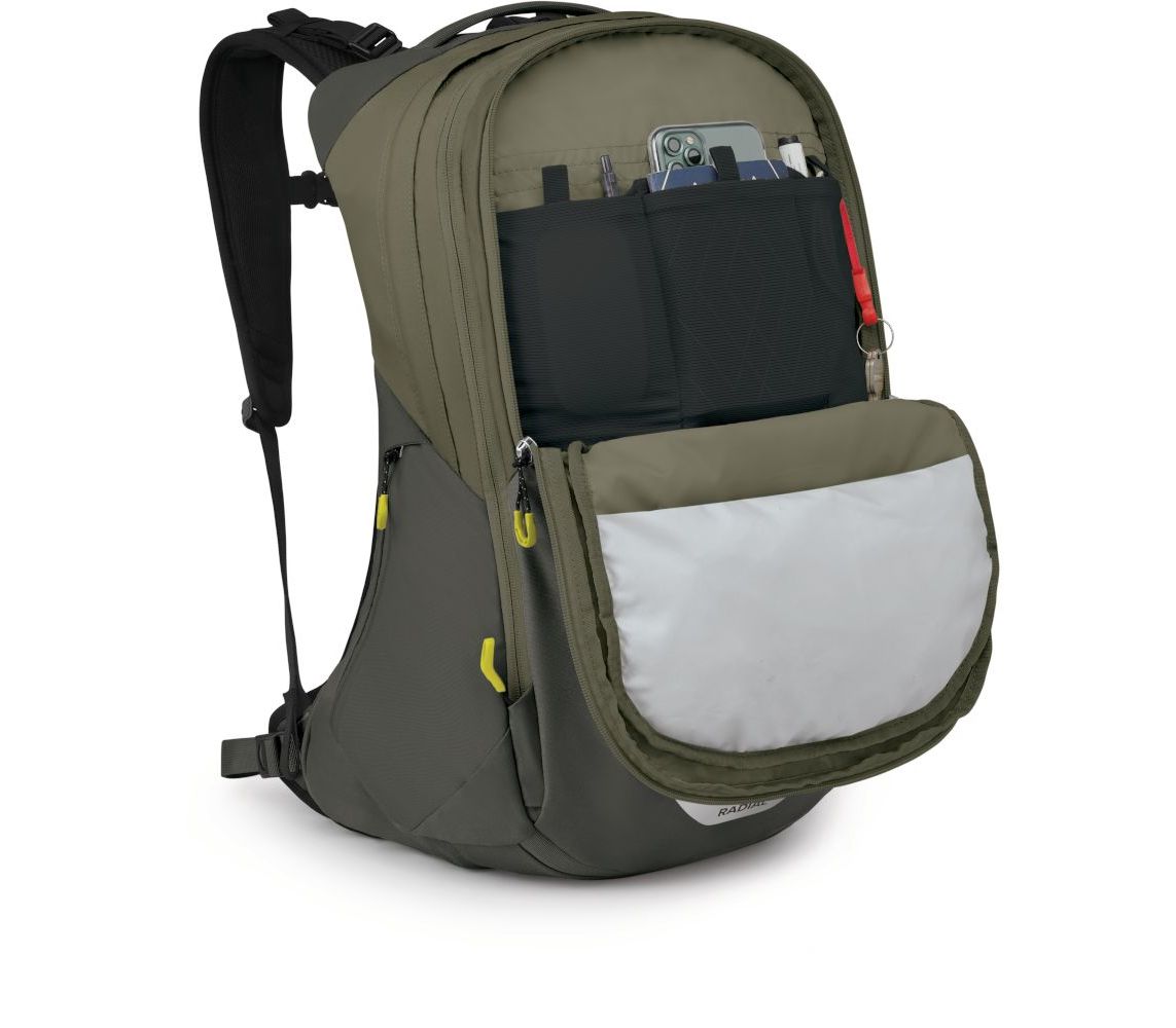 Стильний, зручний та добре вентильований рюкзак Osprey Radial є ідеальним варіантом для активного відпочинку. Конструкція задньої панелі AirSpeed™ з підвісною сіткою забезпечує максимальний комфорт під час руху, а інтегрована підставка Kickstand утримує рюкзак у вертикальному положенні та гарантує легкий доступ. Об’єм моделі регулюється від 26 до 34 літрів з допомогою спеціальної системи розширення на блискавці. Osprey Radial має безліч корисних кишень для зручної організації особистих речей та м’яке відділення для ноутбука, яке гарантує безпечне транспортування ваших гаджетів. Окрім того, він оснащений чохлом для захисту від дощу та кріпленням LidLock™ для велосипедного шолома.