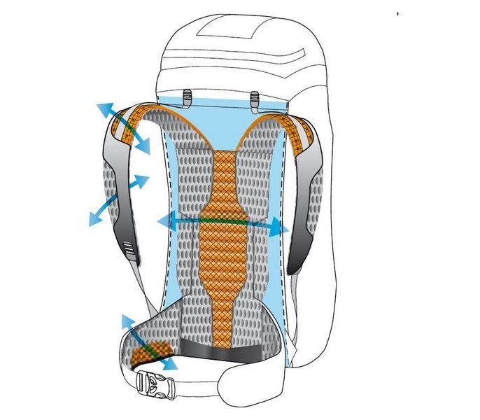 Спина: имеет современную систему вентиляции, благодаря комбинации перфорированных вертикальных полос из EVA-пены и покрывающей их сеточной ткани. Таким образом между спиной пользователя и спинкой рюкзака движется постоянный поток воздуха, а спинка при этом сохраняет и малый вес и компактность рюкзака.