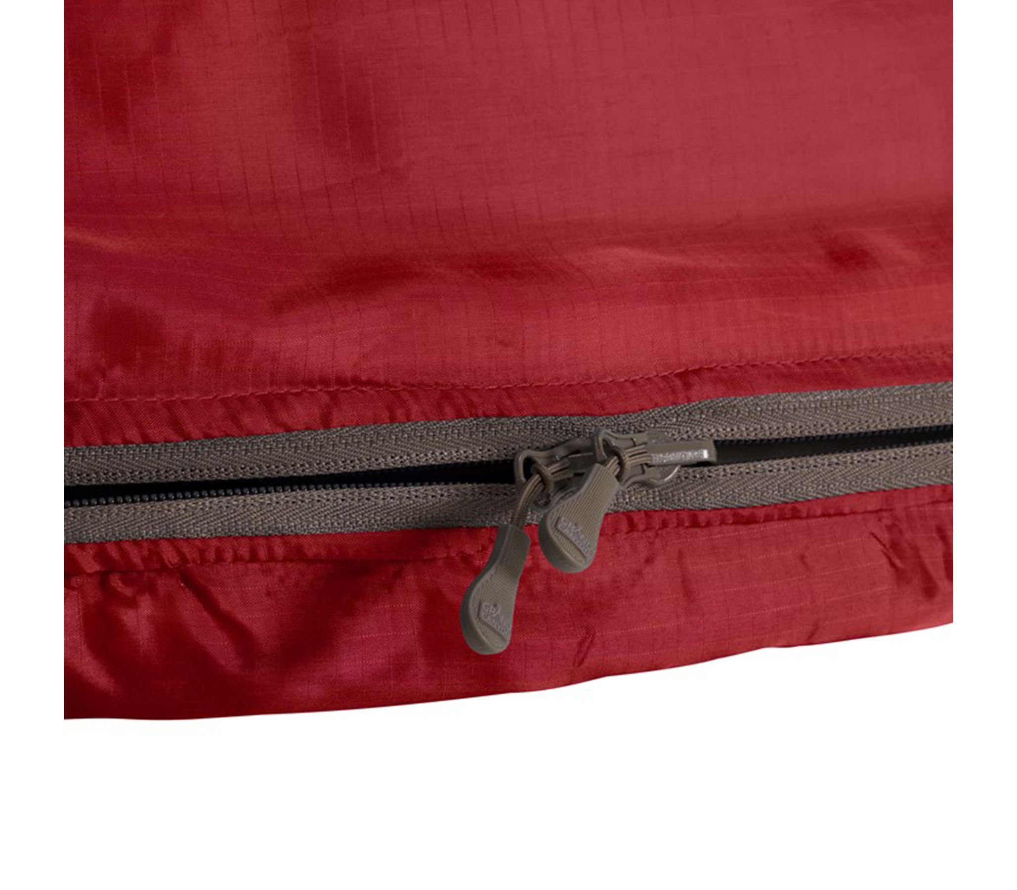 - Молния оснащена двумя замками, верхний из которых - двусторонний. Таким образом молния удобно расстегивается и застегивается как снаружи, так и изнутри, позволяя также открыть нижнюю часть спального мешка для проветривания.