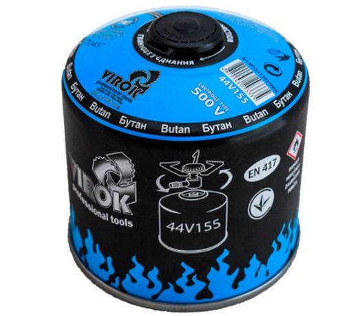 Балон газовый VIROK с резьбой 500 гр/870 мл. Состав: (EN417) BUTAN [12]. Применяется для туристических газовых горелок, кемпинговых газовых плиток.