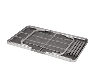 Столешница изготовлена из прочного МДФ серого цвета, каркас - из легкого алюминия. Благодаря съемным ножкам, складной столешнице и толщине менее 4 см в сложенном виде, стол компактно хранится и легко транспортируется. Сетка под столешницей позволяет удобно хранить мелкие вещи, посуду и продукты.