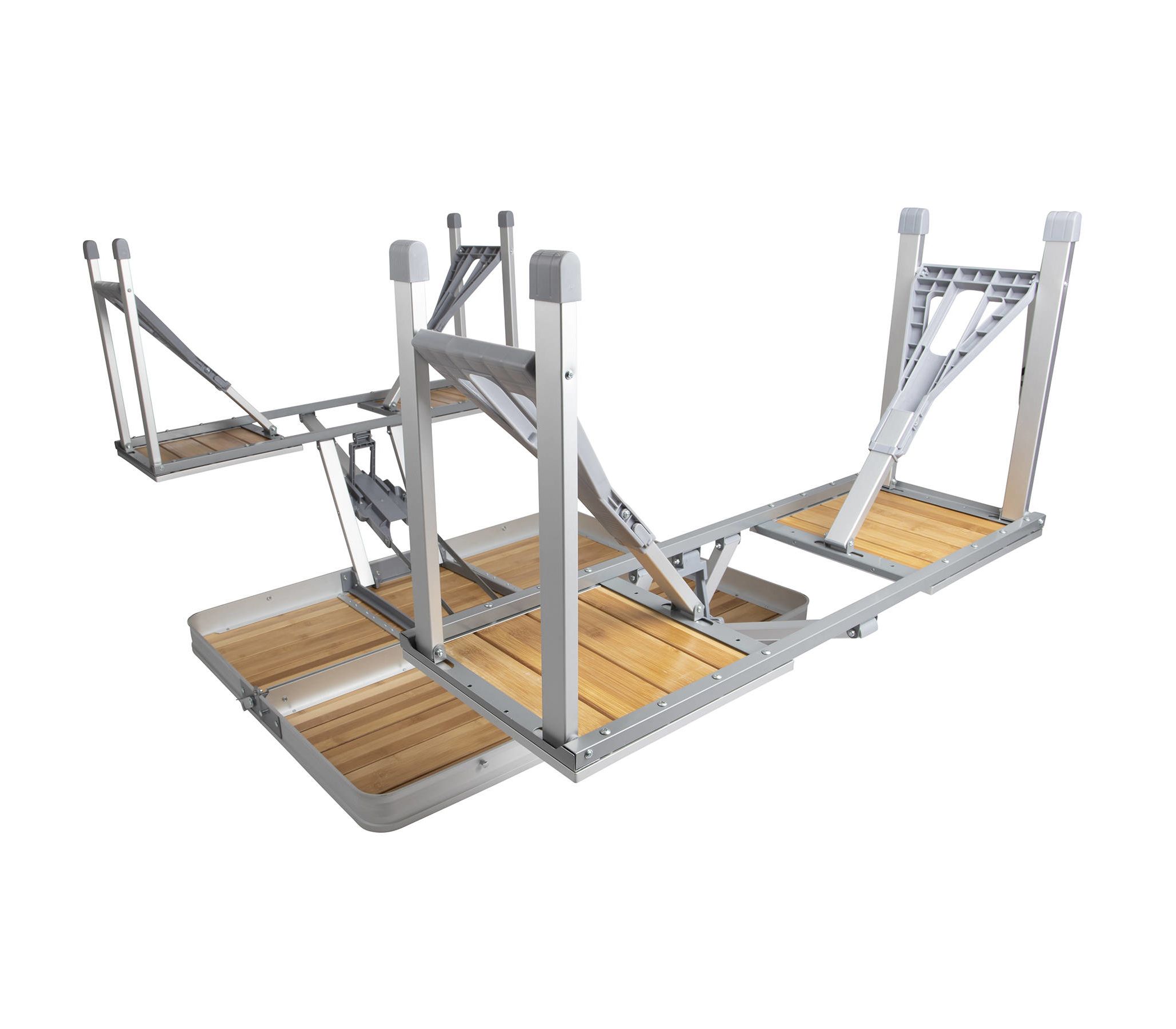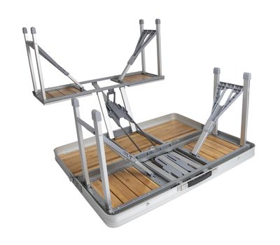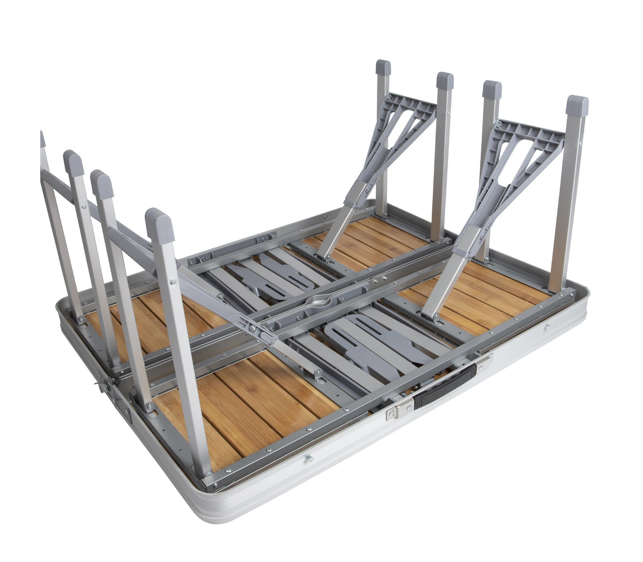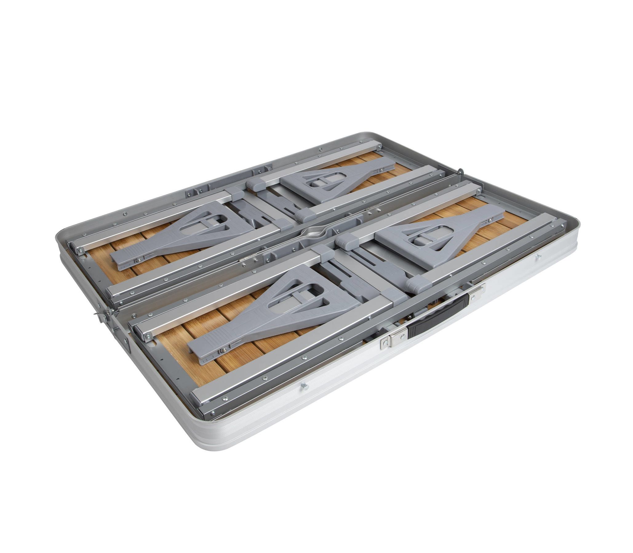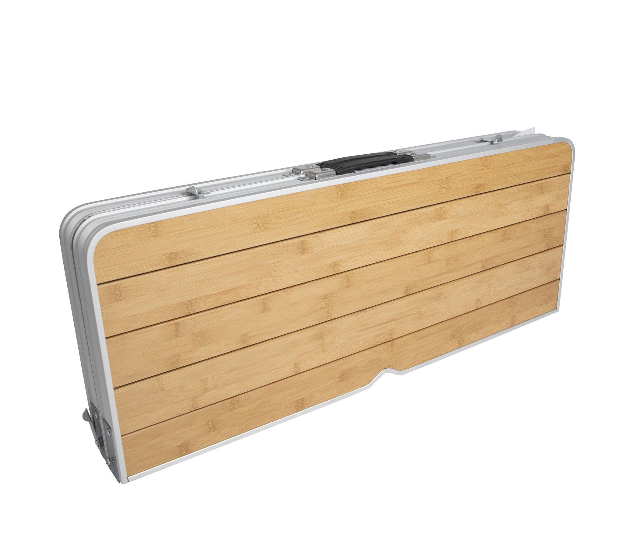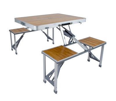 - Стол и стулья компактно складываются, трансформируясь в алюминиевій кейс с бамбуковыми стенками и ручкой