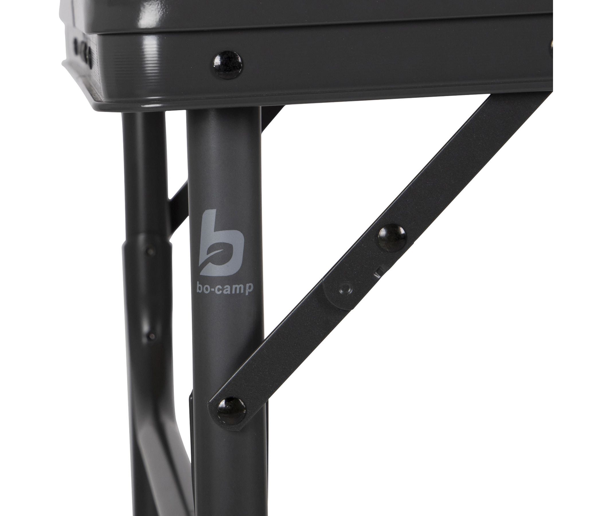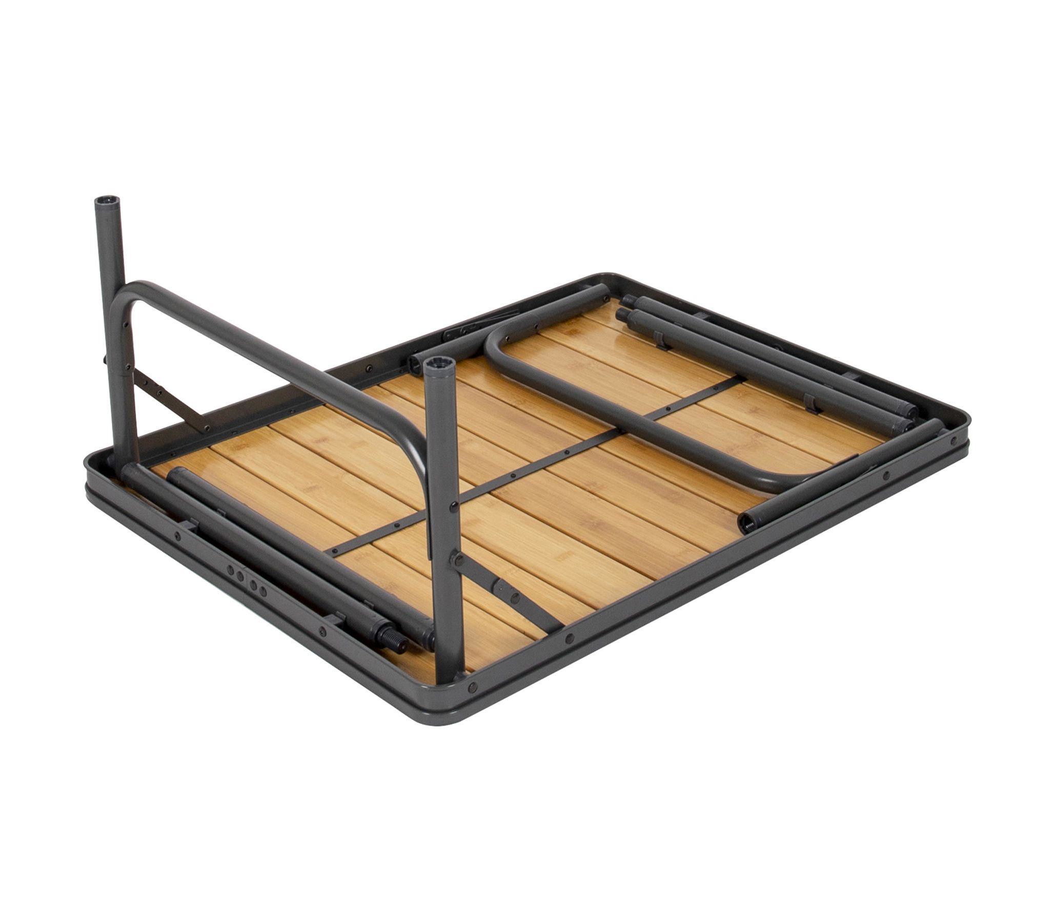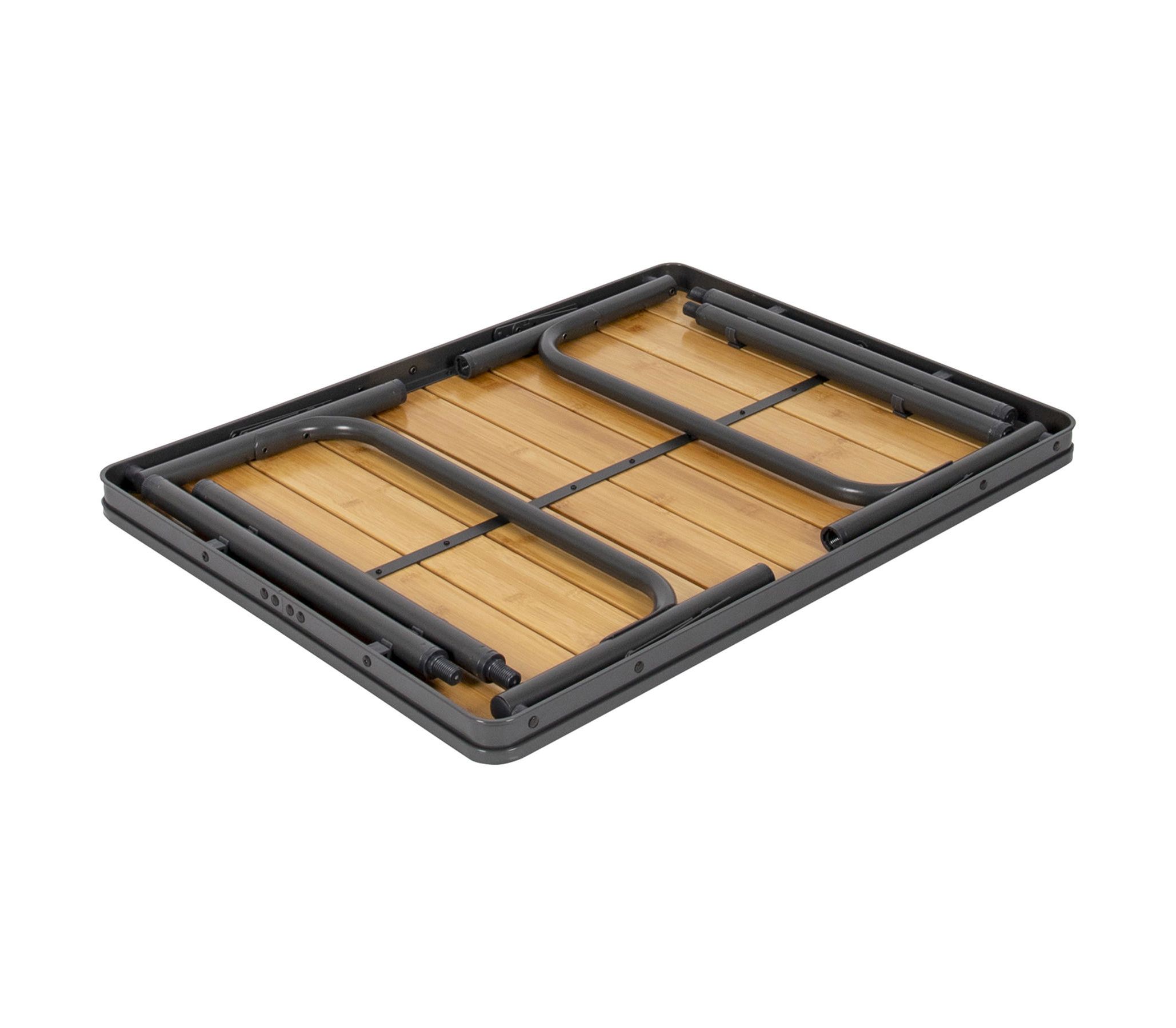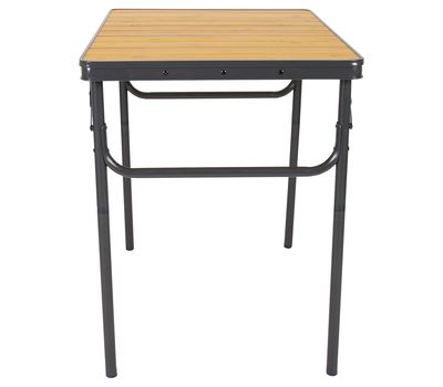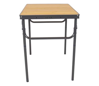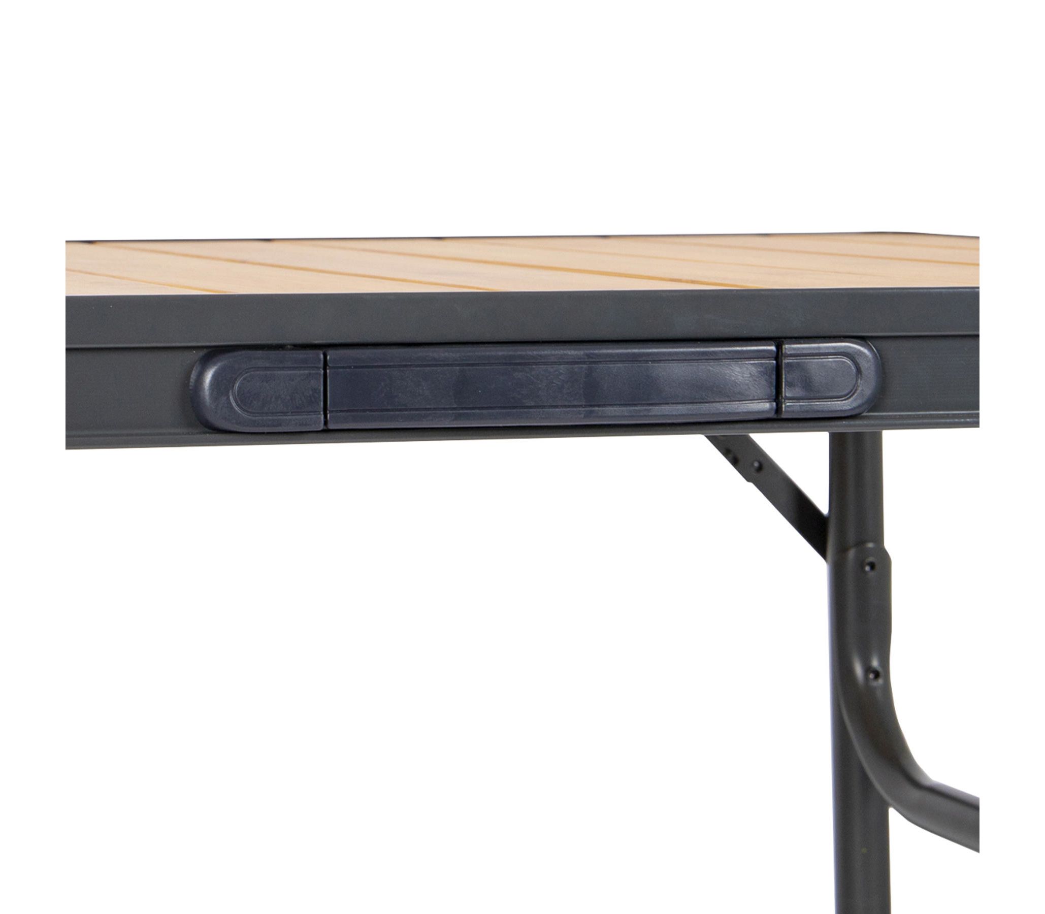 Каркас выполнен из легкого, но прочного алюминия, что обеспечивает устойчивость при весе всего 4.3 кг. Складные ножки позволяют быстро и удобно складывать стол, а благодаря встроенной ручке для переноски его удобно транспортировать. Стол имеет регулируемую высоту (31/71 см), что позволяет легко адаптировать его как к обеденному столу, так и к кофейному варианту. Алюминиевый кант по периметру столешницы не только добавляет прочности, но и защищает края от повреждений.