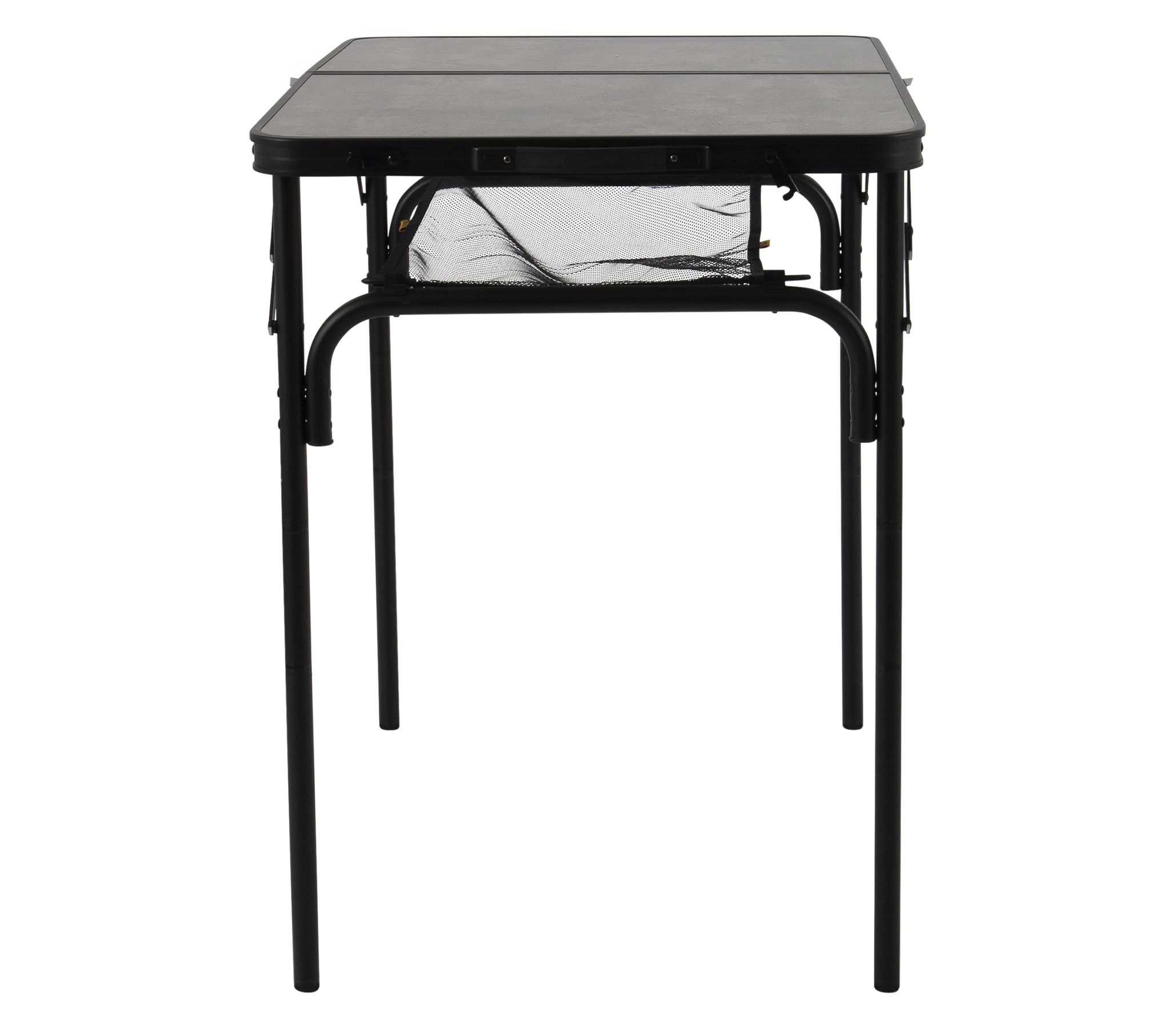 Столешница изготовлена из МДФ с фактурой под бетон и имеет привлекательный индустриальный вид. Под столешницей расположена текстильная сетка для хранения вещей или продуктов, а винтовые регуляторы на ножках помогут установить стол ровно даже на неровной поверхности. Стол рассчитан на нагрузку до 20 кг.